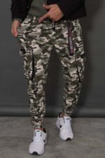 Calça camuflada cargo modelo com bolsos laterais fechamento