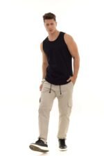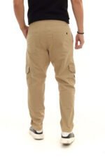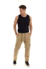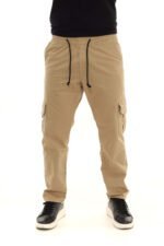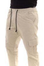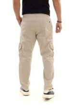 Uma calça cargo feita de uma mistura de algodão e elastano, oferecendo conforto e flexibilidade. Possui bolsos adicionais nas laterais para praticidade e estilo utilitário.